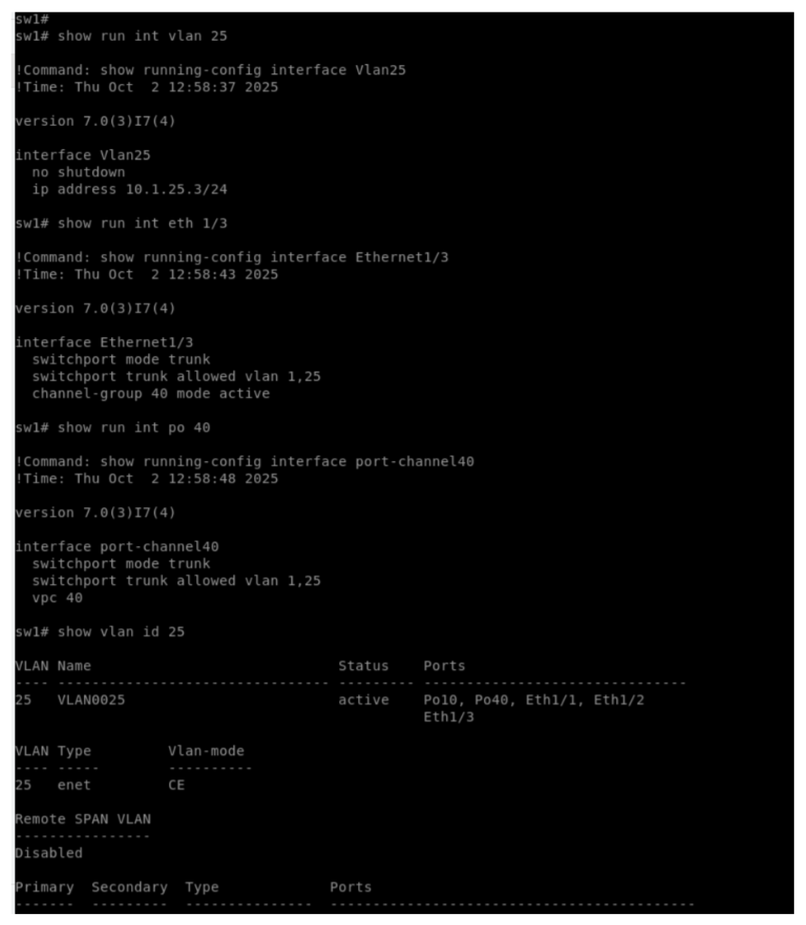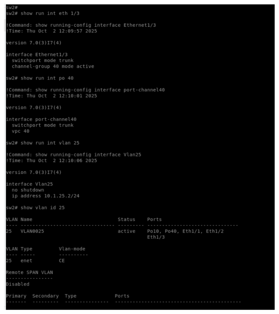 Enabling interface VLAN and creating VLAN, creating VPC port channel 40 and enabling LACP port channel 40 on the interfaces connecting to other end switch.