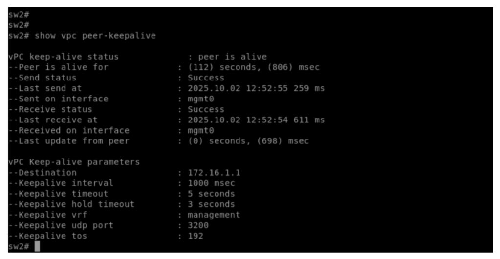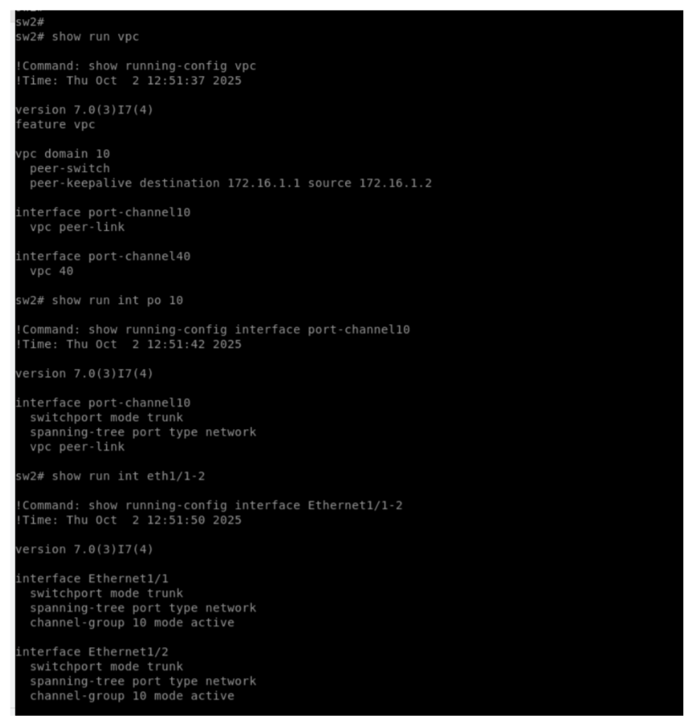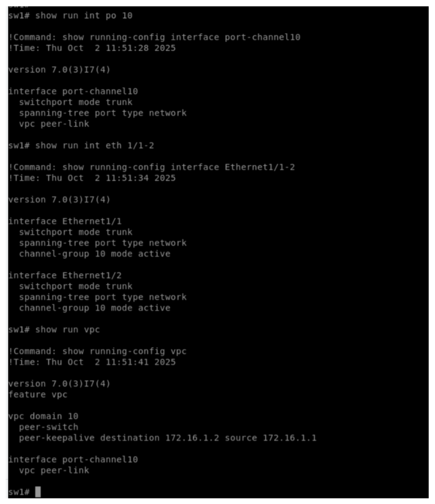 Activating VPC management domain, placing all the VPC peer switch connected interfaces in “spanning-tree port type network”, declaring a VPC peer switch under VPC domain and declaring port channel between the VPC peers as a VPC peer link.