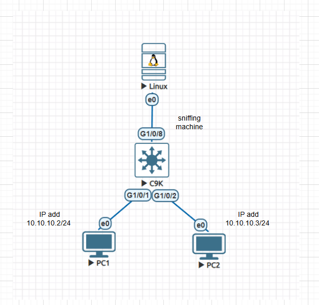 Connectivity diagram of setup to capture packets using TCP dump, to capture the MAC address table building process