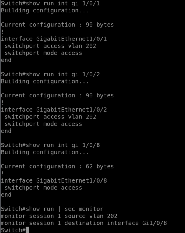 Interface configs and VLAN 202 on interface Gi 1/0/1 connected to PC1, Gi 1/0/2 connected to PC2 and port mirroring of VLAN 202 on interface Go 1/0/8