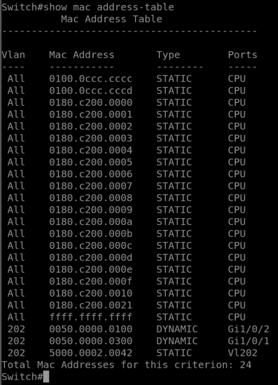 We finally see MAC address to port mapping on the switch
